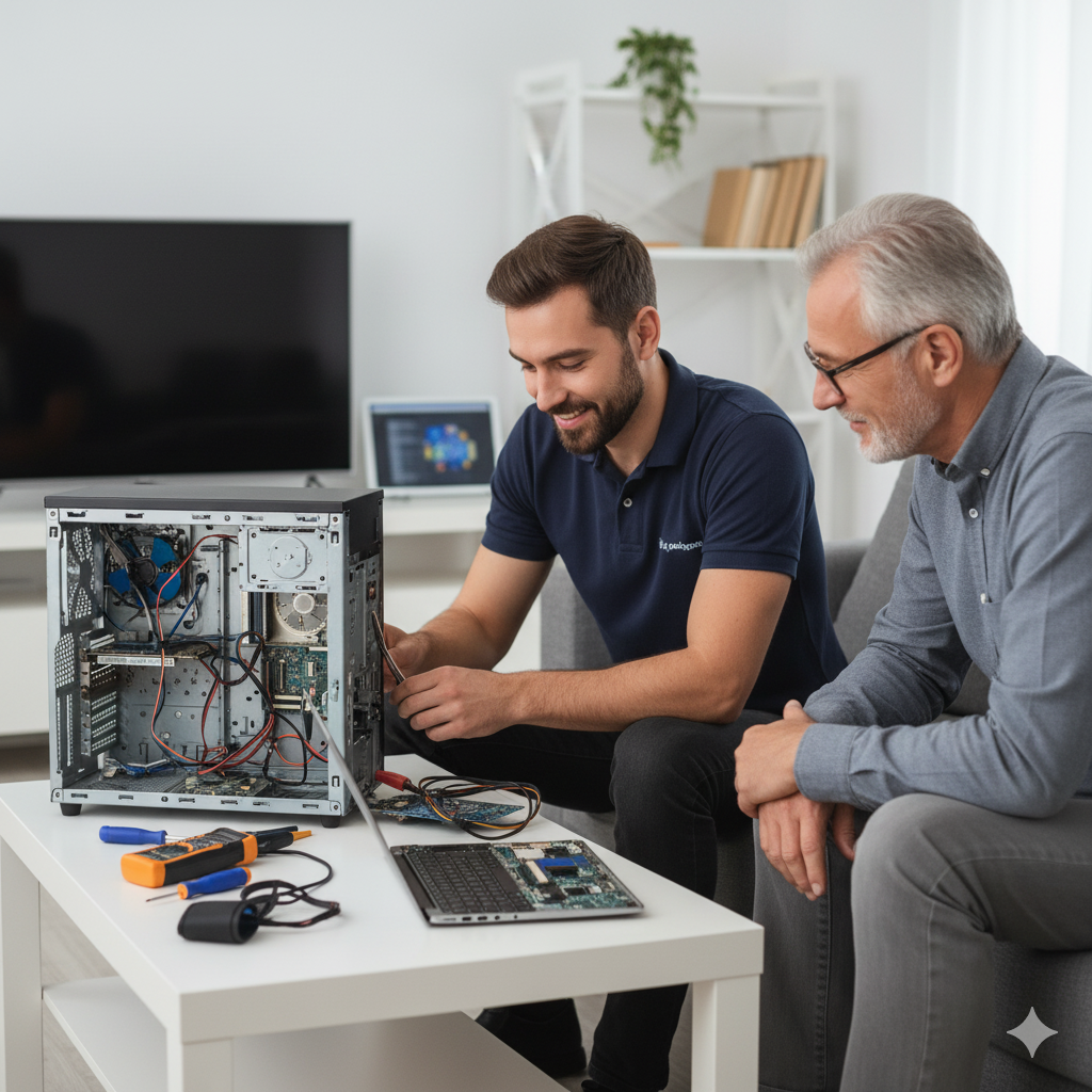 Parce que l'autonomie numérique est essentielle aujourd'hui, nous ne me contentons pas de réparer : Nous vous apprenons à utiliser vos équipements avec confiance. Nous proposons des formations personnalisées à domicile, adaptées à votre niveau, que vous soyez grand débutant ou utilisateur intermédiaire. nous abordons avec vous les bases essentielles : prise en main de l'ordinateur (Windows ou Mac), navigation sécurisée sur Internet, gestion de vos e-mails et classement de vos documents et photos.